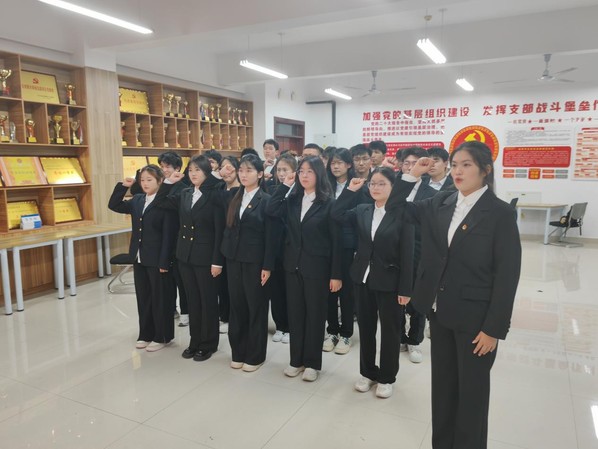 仪式在庄严的国歌声中拉开帷幕,全体人员庄严肃立,高唱国歌,现场气氛庄重而热烈。徐可宣读了新团员名单,25名朝气蓬勃、积极向上青年学子光荣地加入了中国共产主义青年团,为团组织注入了新鲜血液。学院老团员代表为新团员们佩戴上熠熠生辉的团徽,团徽在新团员们的胸前闪耀,象征着他们从此肩负起共青团员的责任与使命。