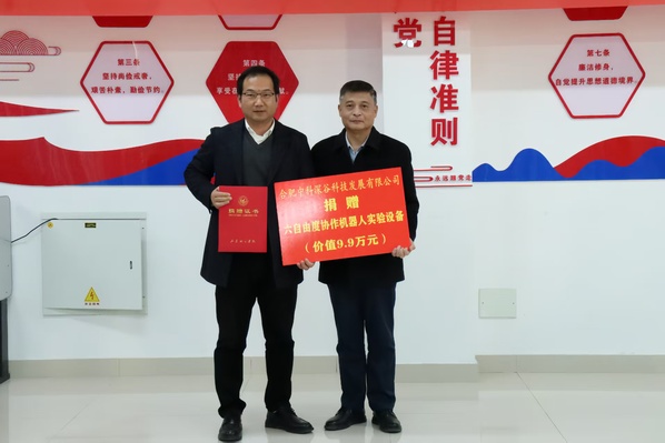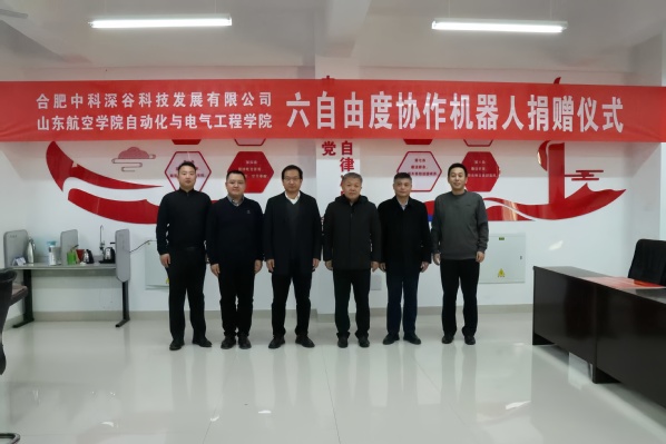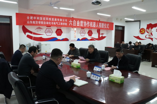 12月4日,千亿国际网页版登录在11教313会议室隆重举行合肥中科深谷科技发展有限公司六自由度协作机器人捐赠仪式。学校党委委员、副校长刘宝民出席仪式并致辞,合作发展处处长赵书杰代表学校接收捐赠并颁发捐赠证书,合肥中科深谷科技发展有限公司副总经理潘超、山东分部负责人周健春,山东大学机器人研究中心主任助理李国梁出席仪式,学院党委书记杜常青主持,学院部分教师代表参加仪式。